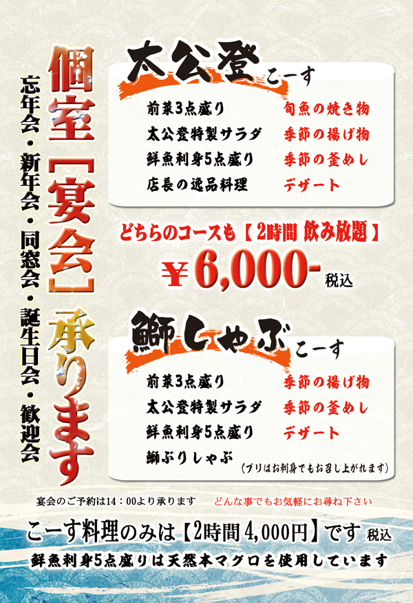 釣宿直送居酒屋:太公登たいこうのぼる、個室居酒屋:太公登(たいこうのぼる)は、